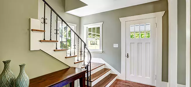 DIVIDE & CONQUER Moulding and trim can be an excellent tool for visually dividing a room. Use chair rail or picture moulding to break up large, flat spaces. This large foyer features classic white wainscoting that helps guide the eye through the room. The historical flair paired with hardwood floors and sleek cable rail is a striking contrast that gives the room a fresh and modern look.